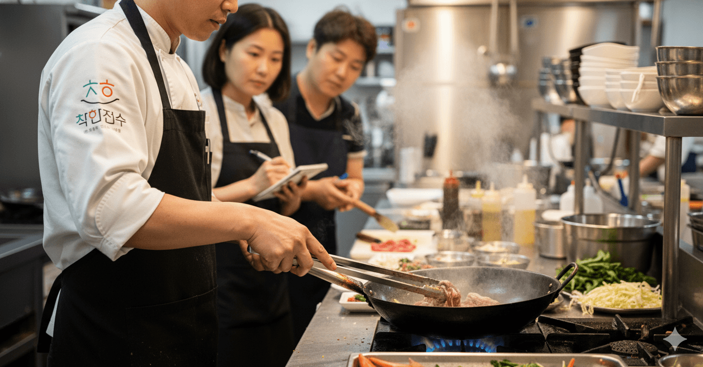 실제와 같은 착한전수 전수장에서 직접 조리하면서, 직원 교육, 플레이팅, 세팅, 비주얼, 배달/포장까지 현장에서 몸으로 익히는 과정을 진행합니다.